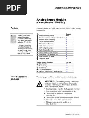 For instance the 1771 ife module has 6 bits or diagnostic information and this represents 6 possible. The 1771 ife input module belongs in the c series and hence is different from series a or b. The analog input module is sensitive to electrostatic discharge. To understand any issues concerning io module compatibility refer to the conversion module wiring diagrams and the installation manuals for the specific io modules involved with particular attention to the specification and wiring instructions. Signals should be connected to the screw terminals on the wiring arm as detailed in figure 53 and the wiring arm should be connected to the front tab connector on the 1771 ife. Industrial automation wiring and grounding guidelines for noise immunity 177041 guidelines for handling lithium batteries ag54 automation systems catalog b111 the 1771 ife module can be used with any 1771 io chassis.