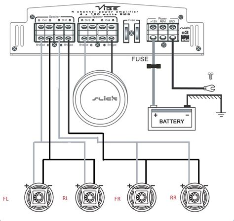 This wiring diagram shows how a full blown car audio system upgrade gets wired in a car. A 4 channel amp for two pairs of speakers and a mono amp for a subwoofer. What are the benifits of this if any. 4 channel amp wiring techniques i heard that some people with four channel amps and four speakersex front and rear deck will wire the right speakers to amp 1 and the left speakers to amp two. They show a typical single channel wiring scheme. Or if the 4 ch.