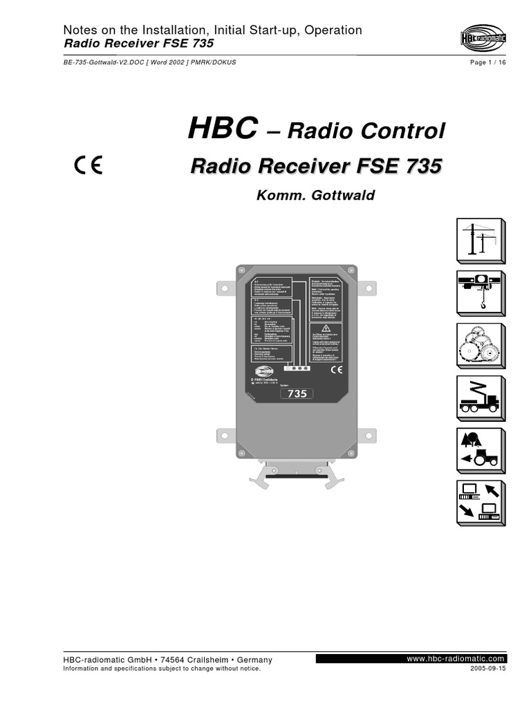 Radio control notes on the installation initial start up operation radio receiver fse 514 be 514i v1 3 fccdocdoc word 2000 mb page 1 18 radio control radio system hbc radiomatic gmbh d 74564 crailsheim germany information and specifications subject to change without notice. Hbc radiomatic gmbh is not liable for any misprints or errors. Tailor made equipment for applications with up to 16 control functions. Haller straße 45 53 74564 crailsheim. Perfect for standard industrial cranes. Hbc control technology proven a thousand times over.