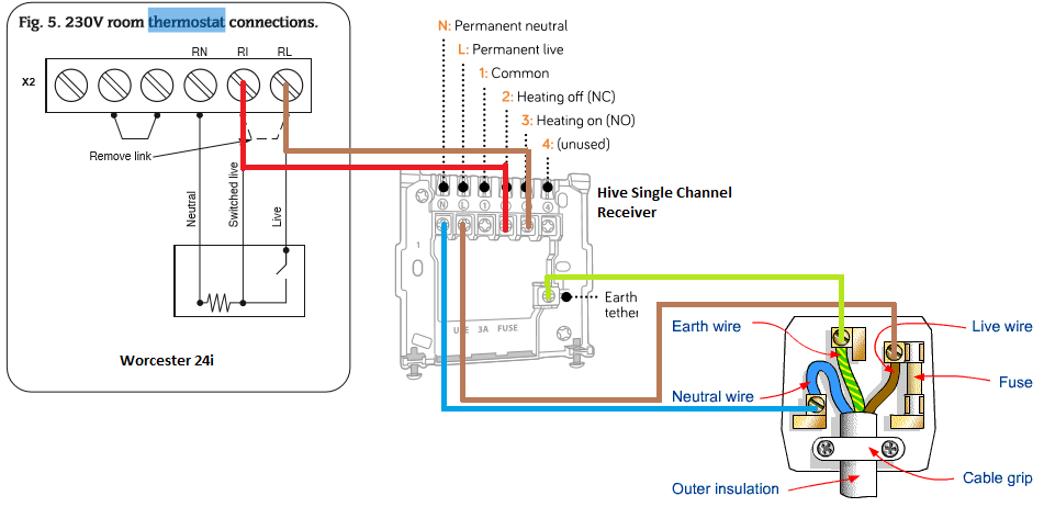 Very unhelpful hive help. Before removing any wires from your current mounting plate take a picture and attach the sticker labels included inside the user guide to these wires. Youll find a tether on the for conventional backplate to secure an earth wire if needed. Single channel receiver for combi boilers dual channel. If you had a wired room thermostat t4 would have connected to that and thence to the zone valve motor but if replacing that with hive you short out the two switch wires to the thermostat or link them together at the control centre wiring panel to simulate that stat always calling for heat. It must be supplied via a switched fused spur with a minimum contact separation of 3mm both live and neutral and fitted with a 3a fuse.