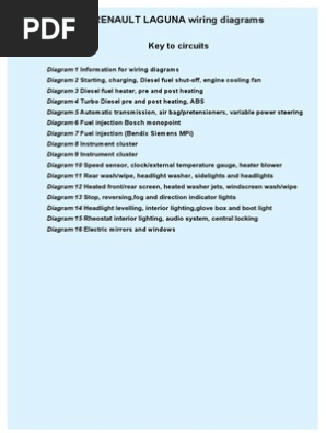 Laguna wiring diagram. Weve got you covered. It shows the components of the circuit as simplified shapes and the power and signal friends amid the devices. Renault laguna wiring diagrams key to circuits diagram 1 information for wiring diagrams diagram 2 starting charging diesel fuel shut off engine cooling fan diagram 3 diesel fuel heater pre and post heating diagram 4 turbo diesel pre and post heating abs diagram 5 automatic transmission air bagpretensioners variable power steering diagram 6 fuel injection bosch monopoint. Explore our vast collection of laguna tools product manuals. Renault laguna 2 wiring diagram wiring diagram is a simplified up to standard pictorial representation of an electrical circuit. Explore our vast collection of laguna tools product manuals.
