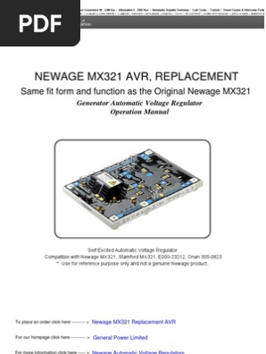 Mx321 is a three phase sensed automatic voltage regulator and forms part of the excitation system for a brush less generator. All stamford generators are supplied with a declaration of incorporation for the. Ay issue 2 5 ref. Control function turn potentiometer. The droop transformer must be connected in the correct main output terminal for proper operation details are as shown in the machine wiring diagram. Excitation power is derived from a three phase permanent magnet generator pmg to isolate the avr control circuits from the effects of non linear loads and to reduce radio frequency interference on the generator terminals.