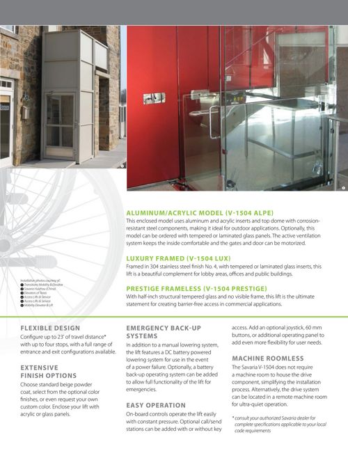We manufacture products that help people maintain their personal mobility whether thats in the home in a public space or in a vehicle. Figure 17 sample hall calls 45 45 flush mount 25 375 3 3 225 surface mount 6 94 in frame 24 part no. Gain convenient easy and reliable access with the savaria multilift vertical platform lift. Vertical platform lift products savaria v 1504 specifications section 14420 typical hydraulic vertical platform lift specifications savaria model v1504 std dry walls or block enclosure 10 general 101 related documents. Savaria multilift vertical deck lift cad details. Multilift unenclosed vertical platform lift durable wheelchair lift for commercial or residential access available in multiple entryexit configurations and platform sizes reliable easily installed acme screw drive lift carries a wheelchair and passenger between 2 stops up to 72 for more stops and higher travel see v 1504 vpl.