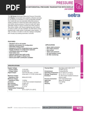 Setras model 264 differential air pressure sensor is suitable for low differential pressure measurements with high accuracy for pressure ranges from 01 100 wc. Its 007 fs accuracy is calibrated using the end point method which improves linearity when compared to competitive transducers which use the best fit straight line method of calibration. This design reduces labor and material costs versus traditional copper piping installations. Setras model 231rs is the industries first multi configurable wet to wet differential pressure transducer utilizing remote sensors. Model 270 pressure transducer general information your setra transducer has been carefully calibrated before shipment to you and it should be handled with the same care given any precision instrument. Conduit opening for electrical termination intended for a 12 id.