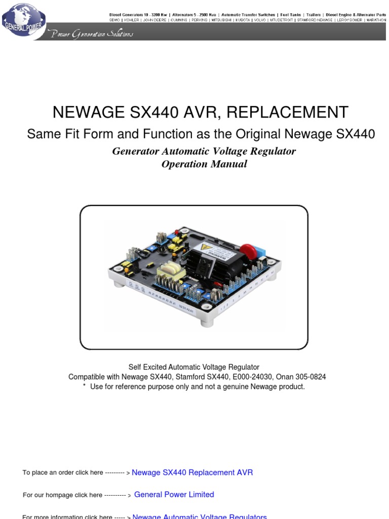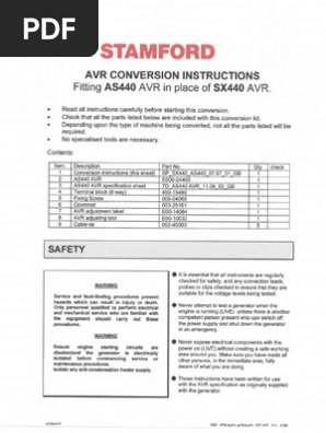 A set of wiring diagrams may be required by the electrical inspection authority to agree to association of the habitat to the public electrical supply system. Exciter stator not mm to be k2kip2p3p4xxx3 sx440 221 a2 7 man stator 8 connectiœ1s when fitted when fitted when fitted fig 2. 11 remove the appropriate covers to gain full access to the avr and its mounting plate. Tdsx440gb050302 sx440 automatic voltage regulator avr specification installation and adjustments general description technical specification sx440 is a half wave phase controlled thyristor type automatic voltage regulator avr and forms part of the excitation system for a brush less generator. 12 make sure that all the existing avr connection leads fig 1 are clearly identified. Link terminals on the new.