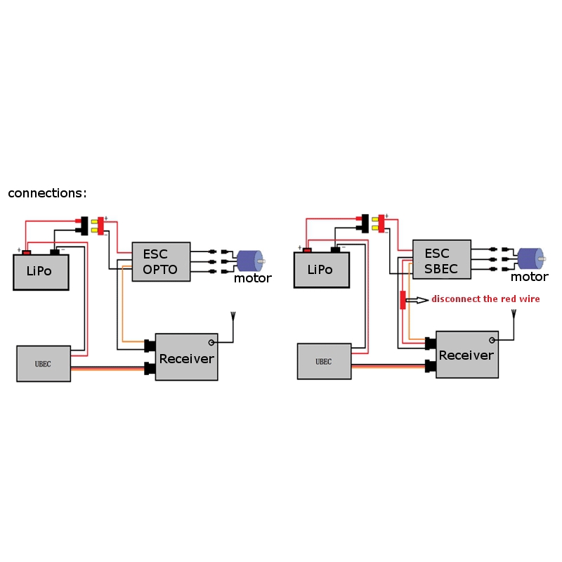 A traditional bec setup. To the diagram below then connect the input end of the ubec to the battery wires. Select from the options below to show the appropriate wiring diagram depending on your particular setup. Confused with how to add ubec for esc that doesnt have built in bec. Ubec wiring diagram the ubec is an external switching mode dc dc regulator.